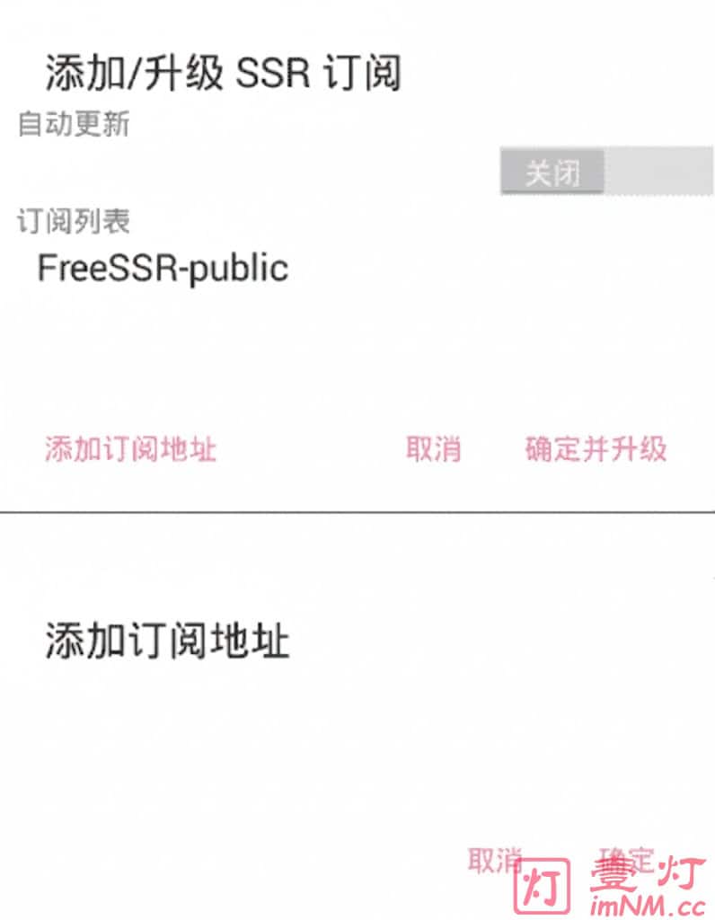 (6)点击开启自动更新,左滑删除订阅列表中的「FreeSSR-public」,然后点击「确定并升级」。如下图所示: