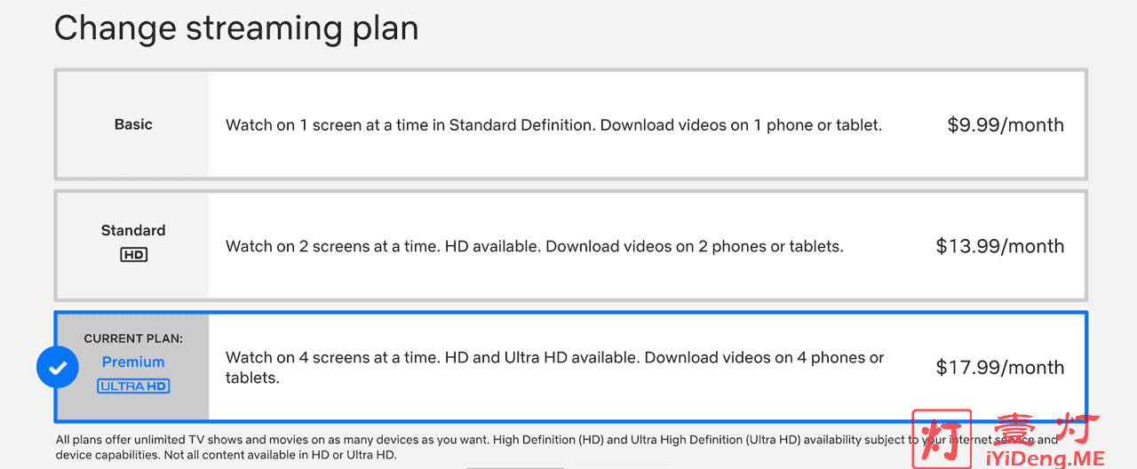 通俗来讲,就是Netflix基础套餐仅支持1台设备同时在线播放标清视频;Netflix标准套餐支持2台设备同时在线播放高清视频;Netflix高级套餐支持4台设备同时在线播放超清视频。