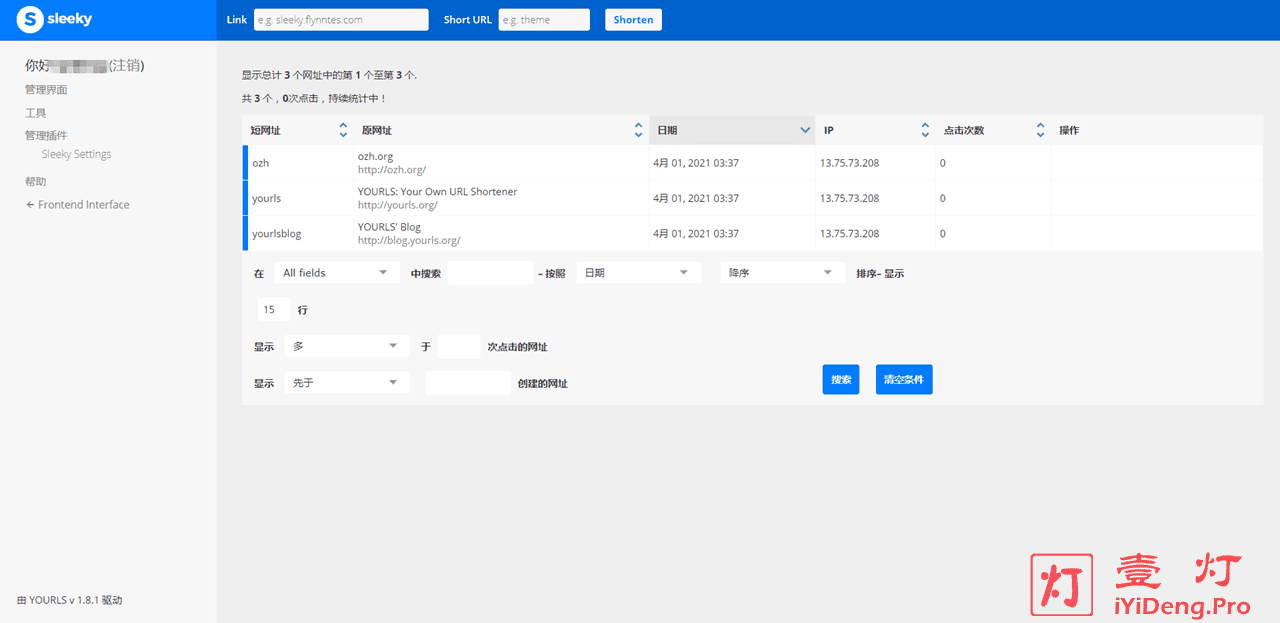 显而易见,YOURLS官方默认主题比较简陋,像是老古董一般,但官方还有其他的主题可选,比如 Sleeky、Infinity Squared 和 Air 666 三款官方推荐主题。其中,Air 666 已经两年没更新了,年久失修,在最新版 YOURLS 1.8.1 使用显示不太正常,Infinity 主题使用有点复杂,主要还是非独立文件夹,容易搞乱文件布局,我不想使用。最后,一灯不是和尚选择了Sleeky,简洁时尚,前端有点简陋,就一个缩短输入框,但是足够用了。再说,我也不想公开使用,所以可有可无,丝毫没有影响。