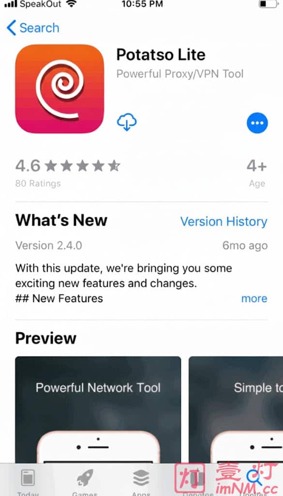 打开页面后,我们需要在Iphone上安装Potatso Lite,到苹果手机应用商店搜索“Potatso Lite”,并进入下载页面,如下图所示: