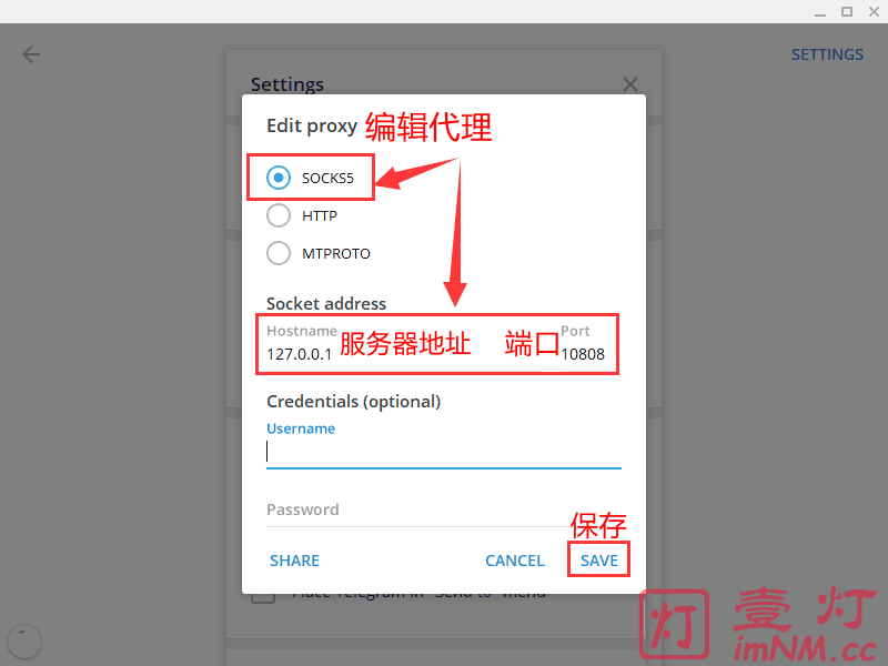 我们都知道,Telegram 在中国大陆地区是无法访问的,所以在登录之前我们必须设置好科学上网代理。由于手机端代理一般都是全局模式,无需进行特别设置即可正常使用,但电脑端的很多代理软件并未开启全局模式,需要我们单独设置。首先,打开 Telegram 程序,然后依次点击“START MESSAGING”-右上角的“SETTINGS”按钮,打开“设置”选项,如下图所示: