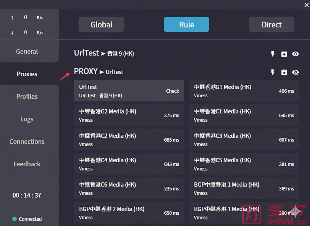 可以在左侧 「Proxies 」标签卡内策略组选择路由模式和切换节点,「Global 」全局代理模式,「Rule」 根据配置文件规则分流,「Direct」 直连模式。展开「PROXY」策略组选择你需要使用节点,如下图所示: