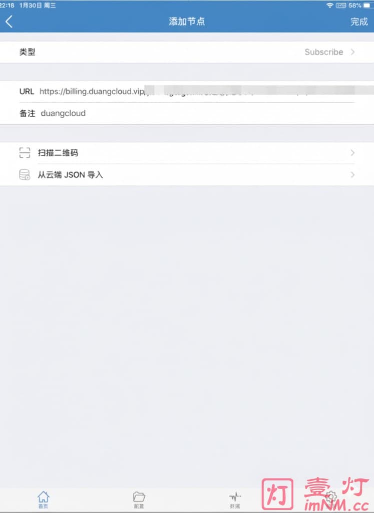 打开 Shadowrocket 点击右上角的 + 号 添加配置,类型选择「Subscribe」,然后 URL 处粘贴你复制的订阅链接,备注随意填写,点击完成。
