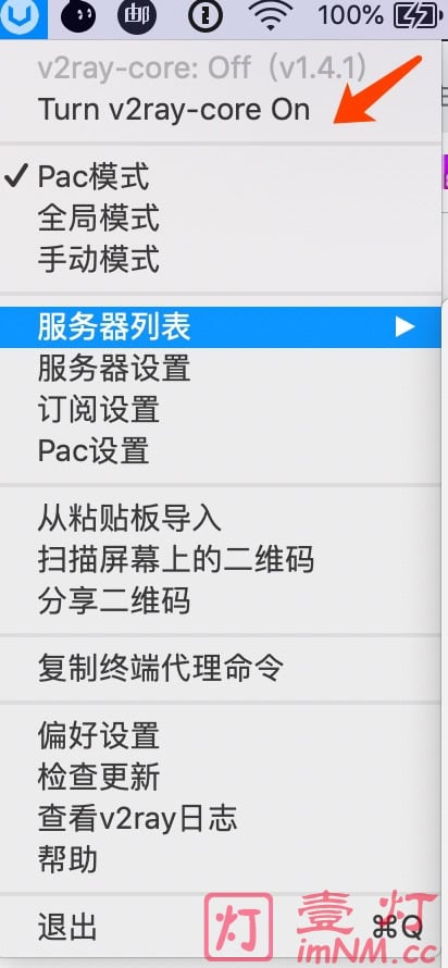 订阅导入节点成功后一般会自动开启代理,可以看到 v2ray-core: on 状态,展开V2RayU其菜单,并选择 「Pac模式」。在 「服务器列表」 中选择节点,点击 「Ping Speed」可以检查节点的延迟和可用性(可能会卡顿几十秒)。关闭代理:点击 「Turn v2ray-core Off」可关闭代理,反之 「Turn v2ray-core On」可开启代理。