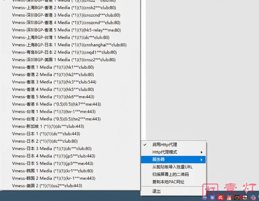选择最小化V2RayN程序,[服务器] 选择你需要使用的节点。然后右下角选择节点启用HTTP代理以及路由模式(图6),「HTTP代理模式」选择 「PAC模式」。