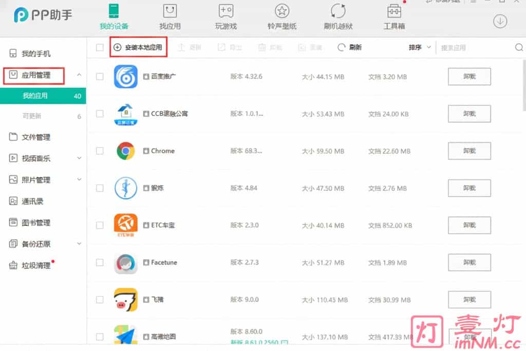 连接上手机之后,点击左侧菜单【应用管理】-【安装本地应用】。如下图所示: