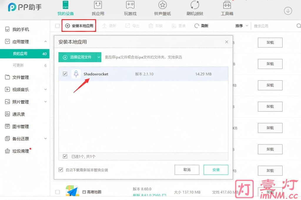 然后【选择应用文件】(刚才从百度网盘下载的Shadowrocket.ipa),点击【安装】,稍等片刻即可成功安装Shadowrocket到你的iPhone苹果手机。如下图所示: